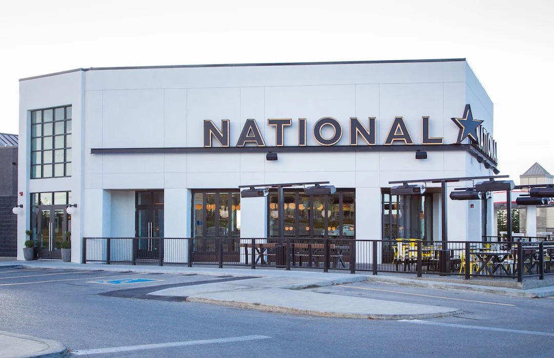 Alumicor 2500 Series Curtainwall, Telescoping Automatic Doors, Custom Aluminum Band Around the Light Tower Signage